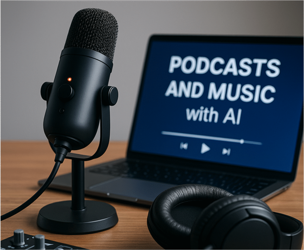 Producción de podcasts y jingles/canciones creados con IA: guion, locución (voz natural o clon con consentimiento), edición, limpieza, subtítulos, traducción y versionado multidioma, sin necesidad de cabina de grabación.